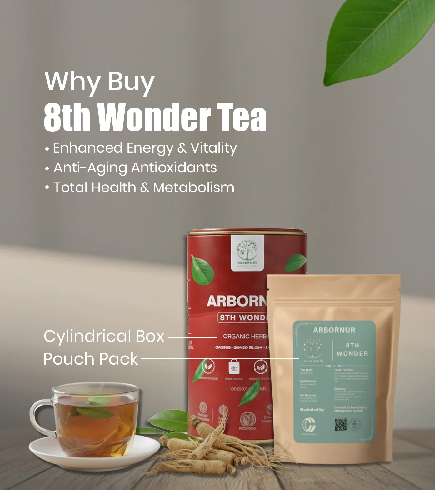 Just one drink a day of 8th Wonder (Ginseng tea online) can help you feel refreshed and maintain a youthful, healthy appearance. This unique blend is made with high-quality dried botanicals, including Korean Ginseng root, Licorice, and Ginkgo biloba, all known for their traditional health benefits. Taking its strength from the Ginseng Bonsai tree, this blend supports energy, circulation, and overall wellness—nature’s beauty secret in every sip. This carefully mixed organic herbal combination works together to: